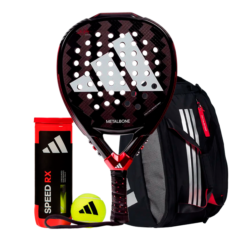 ¿Quieres equiparte como Ale Galán? Aquí tienes el pack de un auténtico número 1, compuesto por su pala Adidas Metalbone 3.3, el paletero Adidas Multigame y un bote de pelotas Adidas RX.