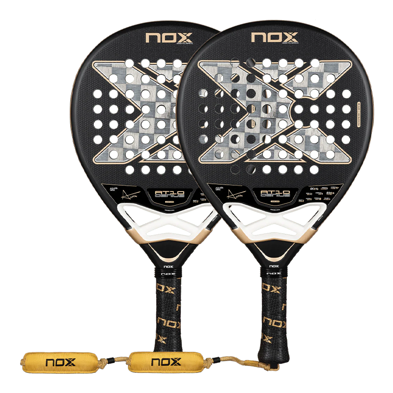 Pack de dos palas NOX AT10 Genius 18K by Agustín Tapia 2026, diseñada con la colaboración de Agustín Tapia, incorpora el innovador sistema Weight Balance para ajustar el balance según tu estilo de juego, garantizando una experiencia totalmente personalizada. Su exclusivo acabado Chromic Paint ofrece una apariencia visual armoniosa y dinámica que destaca en la pista. La superficie Dual Spin, con textura 3D y arena de sílice, optimiza el efecto en cada golpe, potenciando el control y la precisión. Esta pala redefine el rendimiento para jugadores que exigen máxima tecnología y adaptabilidad. Esta AT10 Genius 18K Alum 2026 incorpora núcleo Multilayered Black EVA que equilibra salida de bola y potencia, junto al sistema Weight Balance de contrapesos intercambiables para personalizar peso y balance según el jugador.