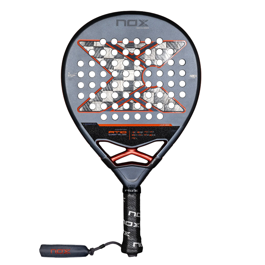 NOX Padel Racket AT10 Genius 18K Alum 2025, the shovel Agustín Tapia for the season 2025. A shovel made hand by hand next to the Mozart from Catamarca with a face Carbon Fiber aluminized and a double rough finish (3D hexagonal in the center and sand texture in the rest) improves the Control and allows you to add more spin to the ball. This version format Teardrop It integrates inside a multi-layer core that combines different rubber densities to optimize ball output in low-speed defensive hits and power in shots. It also incorporates technology Nox custom Grip and Pulse Sytem that improve the absorption of vibrations that reach the hand, reducing joint fatigue