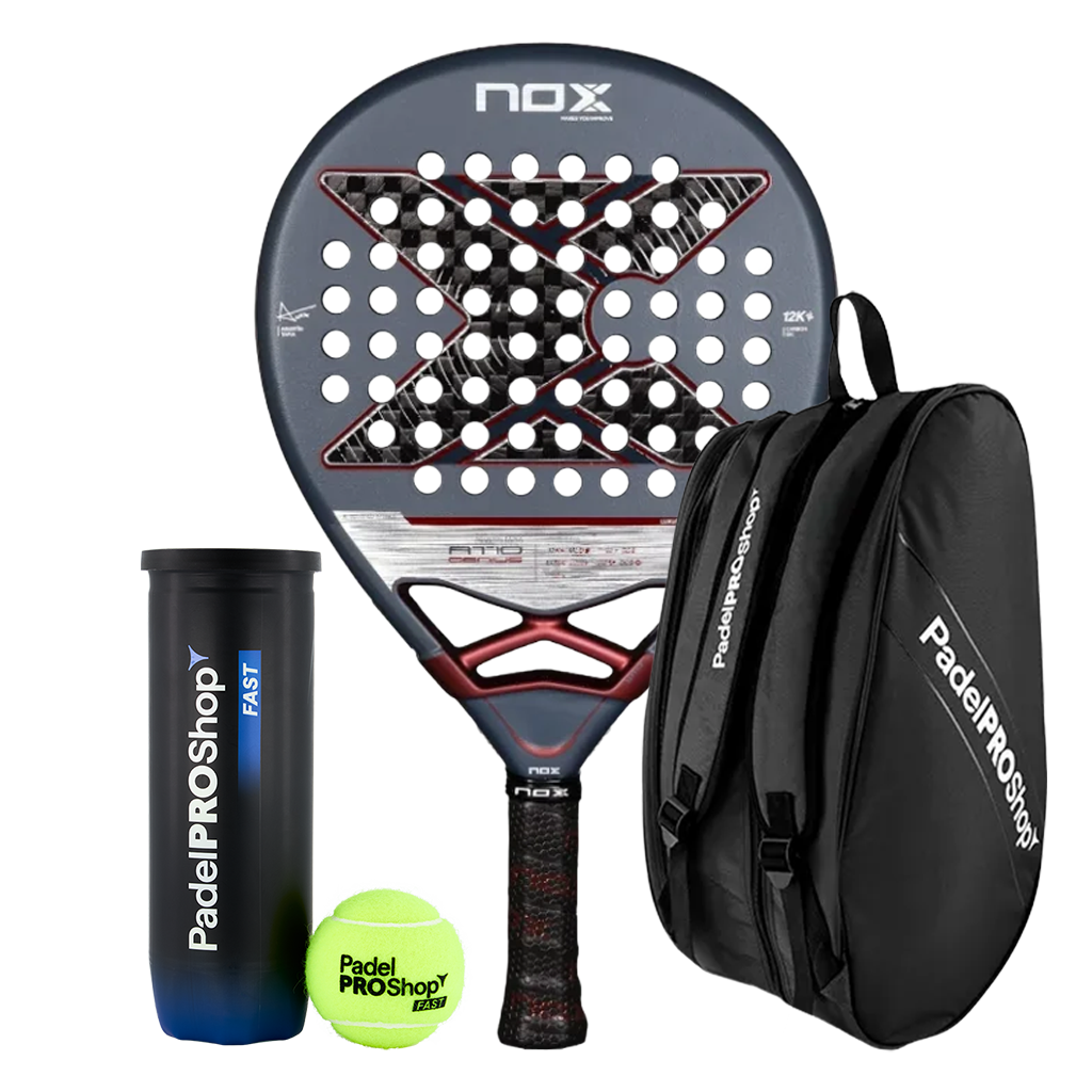 Pack NOX racket AT10 Genius 12K 2025 Agustín Tapia , Padel bag PadelPROShop in color Black and Padel Balls PadelPROShop Fast.