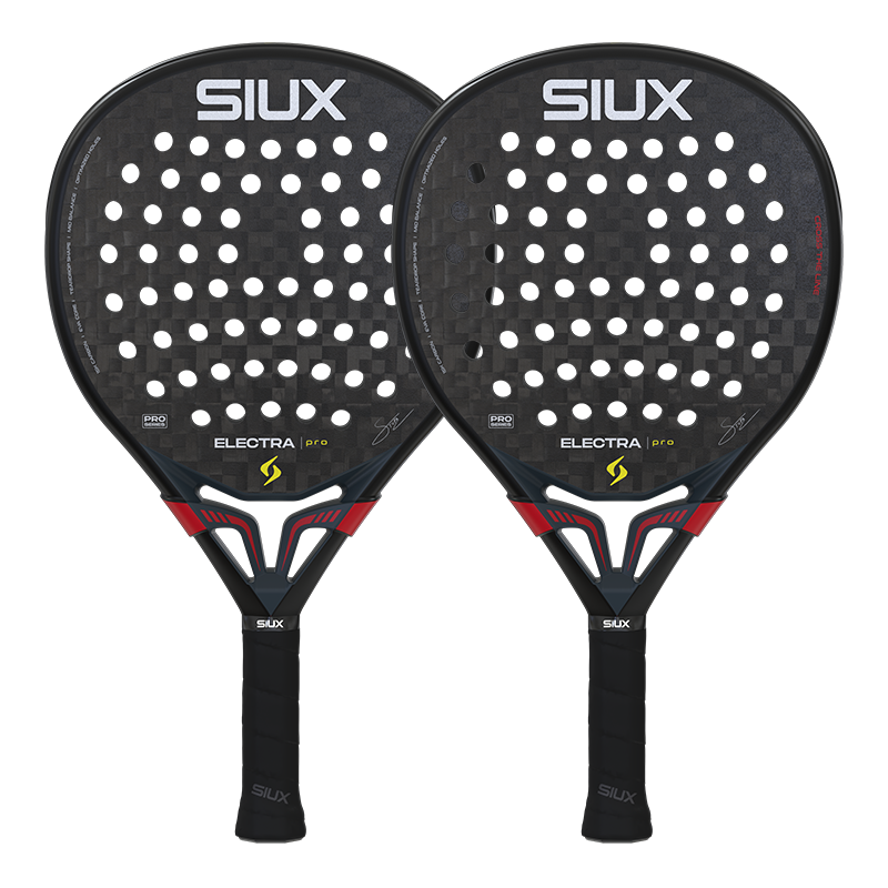 Pack of two Padel Rackets Siux Electra ST5 Pro Shadow Red 2026 Franco Stupackzuk, designed for Professional Players who are looking for a hybrid power game, with Shape of Teardrop that combines perfectly Control and aggressiveness in each blow, ideal for high-level competitors Level who dominate both attack and defense.