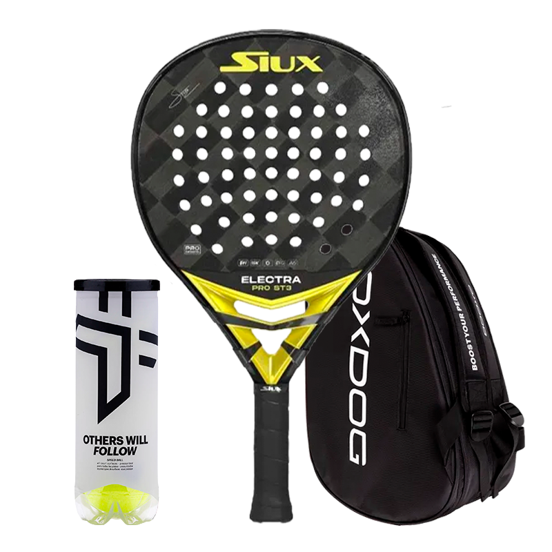 Pack Siux racket Electra ST3 Stupa, Jon Sanz’s racket, created with a mold in Shape of Teardrop and a rubber core EVA Pro, Padel bag Black Oxdog Ultra Toury Padel Balls Oxdog.