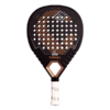 Vibor-A Padel Racket Black Mamba Radical 12K 2.0 with the bridge and the Logo look in tone Yellow gold that harmonizes perfectly with the dark nuances of the carbon and the frame in Black and Gray. The technical specifications remain similar to the previous model, preserving the carbon 12K, the Balance middle and core EVA laminated. However, the finish changes, replacing the rough shine with a smooth matte